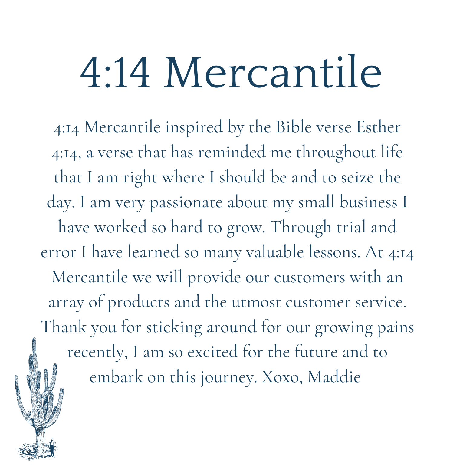 4:14 Mercantile is inspired by the bible verse Esther 4:14. One of my all-time favorite bible verses that prompted me to take the leap and start my business. I have put my heart and soul into this business and I am so happy you found us!!
